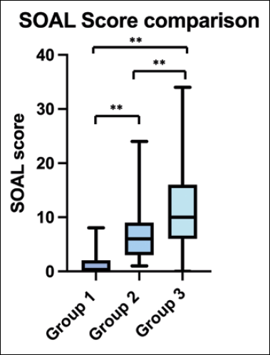 Statistically significant differences in SOAL scores were observed when comparing the three groups (ANOVA: p < 0.0001); specifically, significant differences were observed between Group 1 (average 0.89 + 1.31; CI 95%: 0-3) and Group 2 (mean 6.78 + 4.59; 95% CI: 1-24) (BH: p < 0.01), as well as between Group 1 and Group 3 (mean 11 + 7.47; 95% CI: 0-38) (BH: p < 0.01). Statistically significant differences in the SOAL scores were also identified between groups 2 and 3 (BH: p < 0.01). Figure 1 illustrates the SOAL score comparison between the three groups.