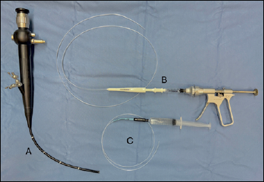 Figure 1. Instrumentation required for the injection laryngoplasty. Operative rhinolaryngoscope (A); flexible endoscopic needle connected to the injection gun (B); irrigation catheter connected to the syringe filled with lidocaine solution (C).
