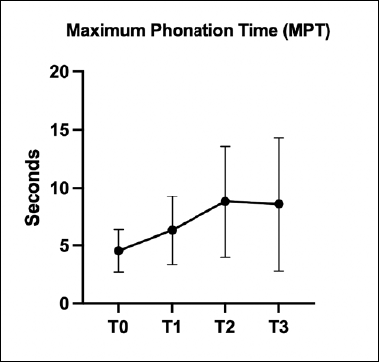 Means and SD for MPT were 4.5 ± 1.8 seconds at T0; 6.3 ± 3 seconds at T1; 8.8 ± 4.8 seconds at T2 and 8.6 ± 5.8 seconds at T3, as shown in Figure 2. Significant differences were found between T0-T1 (p = 0.042), T1-T2 (p = 0.0002), and T2-T3 (p = 0.0014).