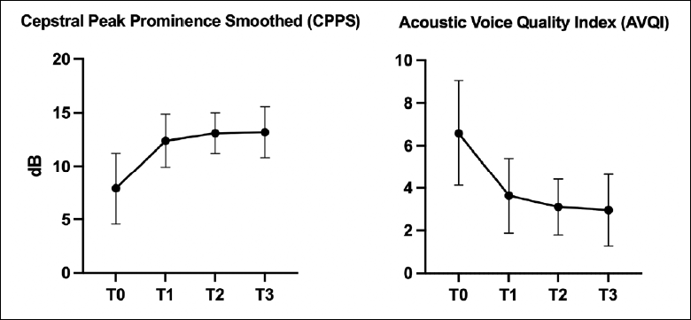 Means and SD for CPPS and AVQI are shown in Figure 3. CPPS values were 7.9 ± 3.3 dB at T0, 12.4 ± 2.5 dB at T1, 13.1 ± 1.9 dB at T2, 13.2 ± 2.4 at T3. AVQI scores were 6.6 ± 2.5 at T0, 3.6 ± 1.8 at T1, 3.1 ± 1.3 at T2, 2.9 ± 1.7 at T3. Significant differences were found both for CPPS and AVQI between T0 and T1 (p < 0.0001), T0-T2 (p = 0.0001) and T0-T3 (p = 0.0001). No significant differences were found between T1-T2 and T2-T3 nor for CPPS or AVQI.