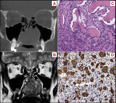 Figure 1. Case 1 from the series. A) CBCT coronal view showing a soft tissue density expansive mass with destructive progression into the palate; B) Contrast-enhanced MRI T2-weighted coronal sequence showing the hypervascularity of the lesion; C) Haematoxylin and eosin stains showing spindle-shaped elements with numerous multinucleated osteoclast-like giant cells, with haemosiderin pigment and haemorrhage, incorporating bone tissue; D) Immunohistochemistry: the giant cells were strongly positive for macrophage marker CD68.