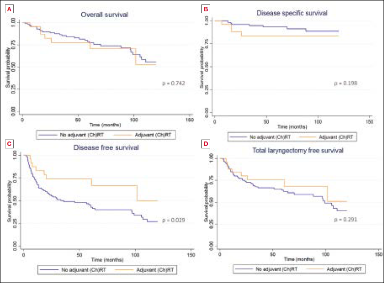 Figure 1. Kaplan-Meier survival estimates for overall, OS (A), disease-specific, DSS (B), disease-free, DFS (C), and total laryngectomy-free survival, TLFS (D), according to adjuvant treatment(s) with (C)RT. (C)RT: (chemo-)radiotherapy.