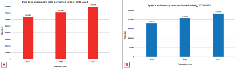 In Italy, 790,245 pure-tone and 230,008 speech audiometry tests were performed in 2023 across the entire country. When taking into account these results, it should be pointed out that the data do not refer to individual patients but are cumulative, and may, in exceptional cases, include repeated procedures on the same person.