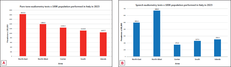 Figure 2. A) Prevalence per 100,000 population of pure-tone audiometry tests performed in Italy in 2023, by geographical area; B) Prevalence per 100,000 population of speech audiometry tests performed in Italy in 2023, by geographical area.