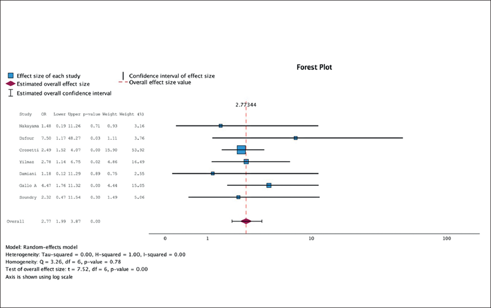 Figure 2. Forest plot of the meta-analysis regarding the association between margin status and recurrence.